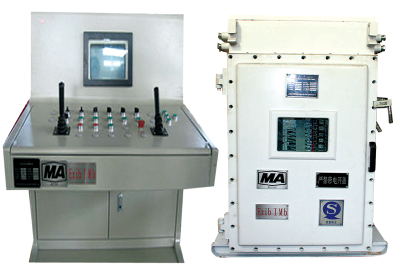矿井提升机防爆变频电控系统,核心设备采用矿用隔爆兼本质安全型交流变频器,配套矿用隔爆兼本安型PLC控制箱、本安型操作台、隔爆显示屏及现场传感器、操作箱、声光显示屏等设备。本系统适用于煤矿井下等含有煤尘、瓦斯或其它易燃易爆气体的场所,适用对象包括井下暗斜井;单水平、多水平;单卷筒、双卷筒等矿井提升机。具有结构紧凑、体积小;调速性能和控制性能优异;安全可靠、使用维护方便等特点。