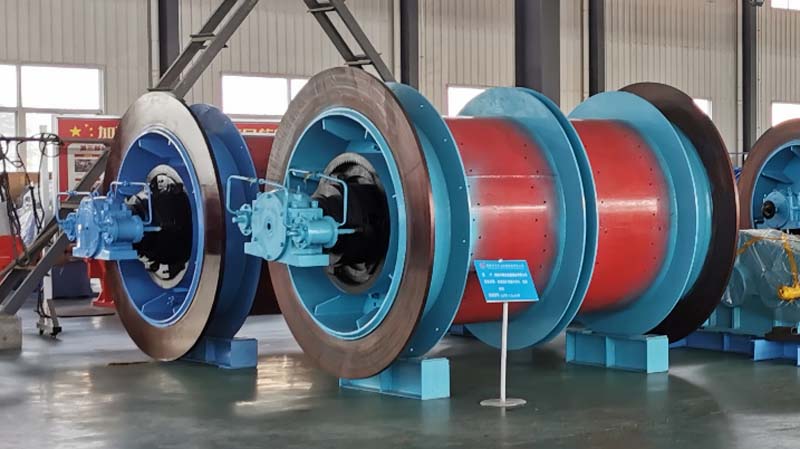 ③卷筒为剖分焊接卷筒,卷筒为剖分两瓣式或四瓣式,制动盘为剖分两瓣制动盘,制动盘用高强度螺栓与卷筒联结。
