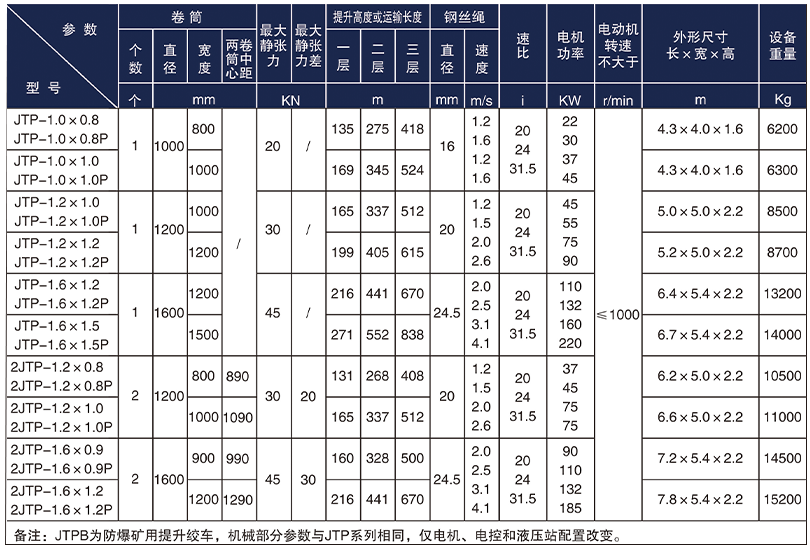 JTP、2JTP系列产品是根据Q/HBWF002《JTP型矿用提升绞车》企业标准、AQ1033-2007《煤矿用JTP型提升绞车安全检验规范》JB/T7888-2010《JTP型矿用提升绞车》行业标准及《煤矿安全规程》设计制造的产品。