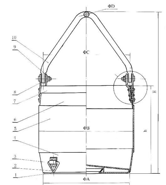 1).桶体下部四周,有四个钩环。2m3 及以上座钩式吊桶,由于钩环强度限 制,只供提升时稳定、移动及更换吊桶时操作之用。